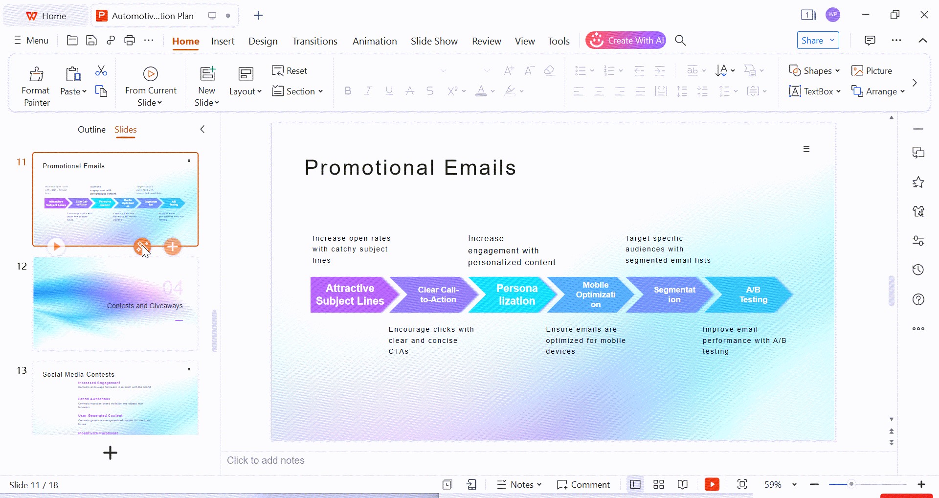 Các bài thuyết trình được tạo bởi WPS AI Slides thường có màu sắc hấp dẫn, tích hợp timeline trình bày trực quan, và bố cục chữ cân đối, hài hòa. Nhờ AI được tích hợp trong WPS Office, người dùng không cần phải tìm kiếm template trên các trang web khác, mà có thể bắt đầu ngay lập tức với nội dung và thiết kế do AI đề xuất.