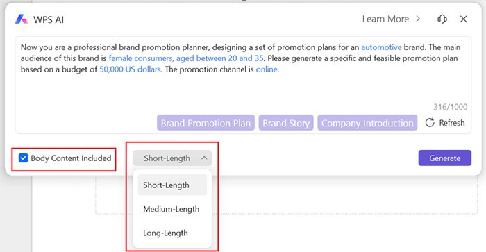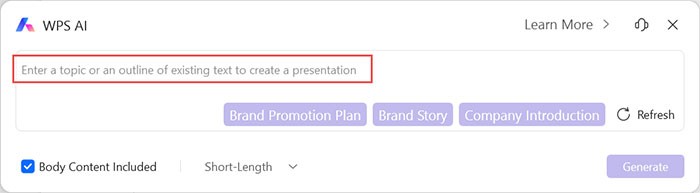 - Kích hoạt tùy chọn Body Content Included nếu bạn muốn AI tự động điền sẵn một phần nội dung cho các slide.