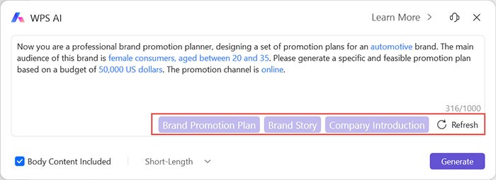 - Chọn một prompt mẫu có sẵn ở góc dưới bên phải để khởi tạo nhanh chóng. Các prompt mẫu này có các từ khóa được đánh dấu màu sắc khác nhau, giúp người dùng dễ dàng nắm bắt và điều chỉnh theo nhu cầu cá nhân. Nếu các gợi ý hiện tại chưa đáp ứng yêu cầu, bạn có thể nhấn Refresh để xem thêm các chủ đề khác.