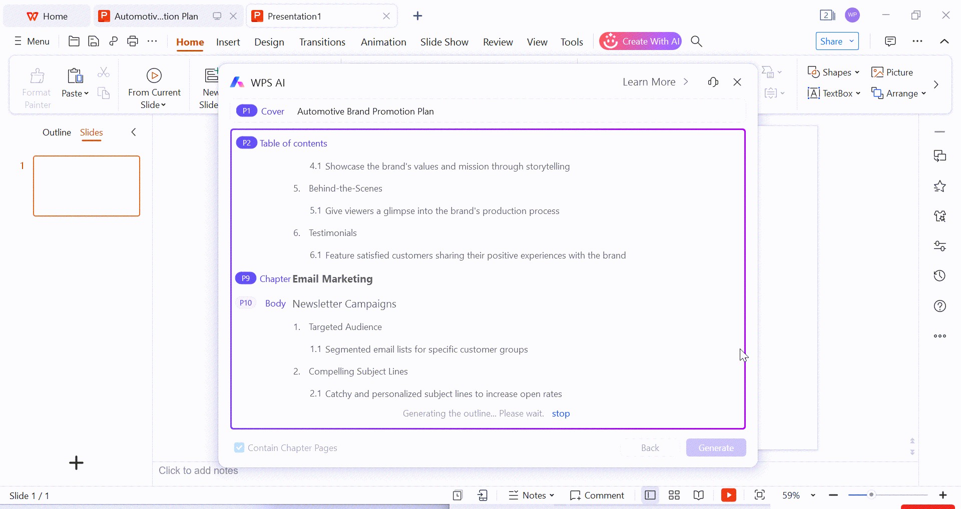 Bước 5: Sau khi đã hoàn tất các cài đặt, nhấn Generate. WPS AI Slides sẽ tự động tạo trang bìa, dàn ý và nội dung chính cho bản PowerPoint của bạn. Số lượng slide được tạo ra sẽ được hiển thị ở góc dưới bên trái màn hình. Nhấn Generate một lần nữa để hoàn tất quá trình.