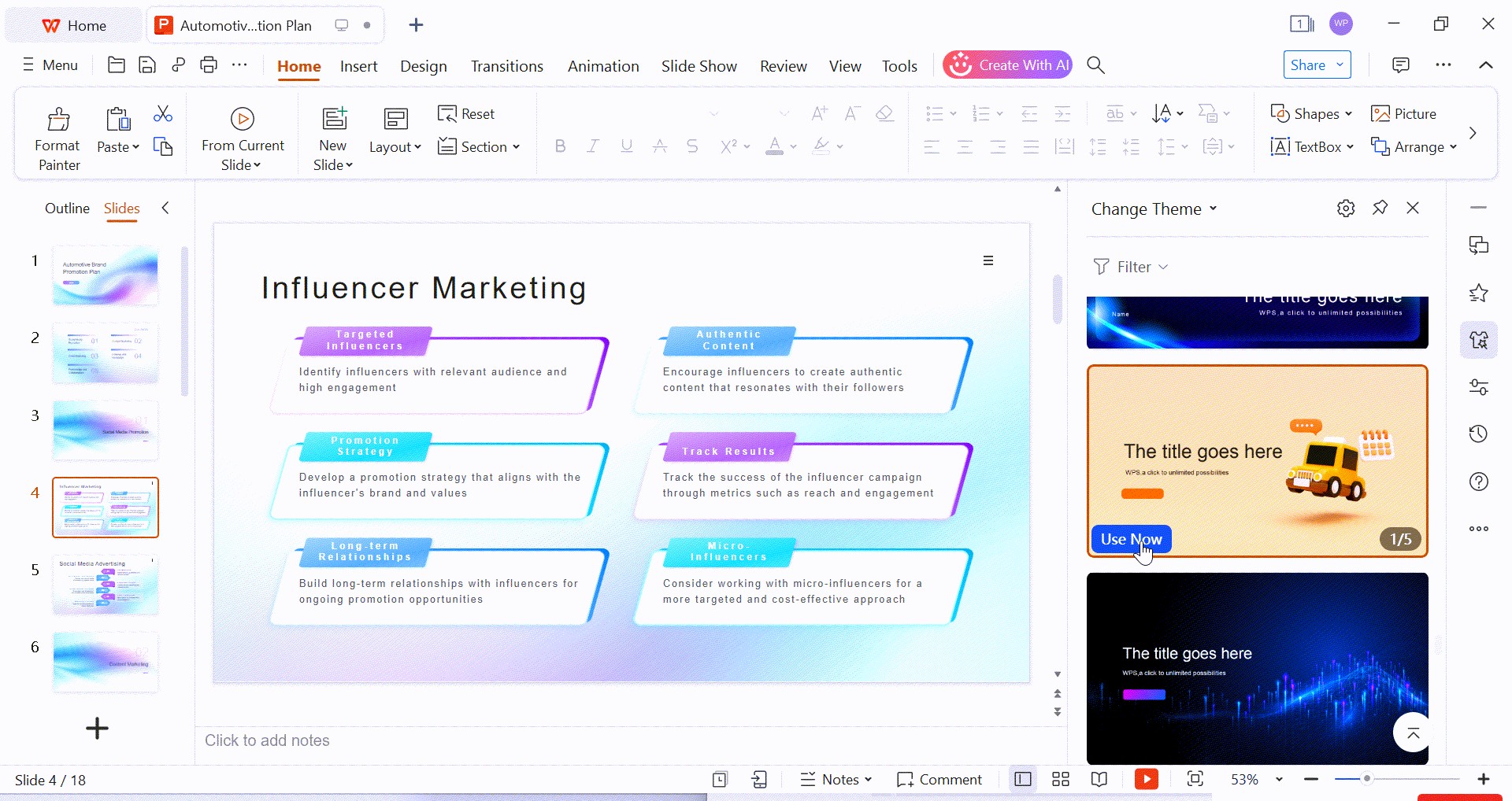 WPS AI Slides tạo ra những bài PowerPoint với giao diện bắt mắt. Tuy nhiên, điểm nổi bật nhất là bảng Change Theme được tích hợp ở phía bên phải màn hình. Việc thay đổi chủ đề trở nên đơn giản, chỉ cần lựa chọn một theme mới và áp dụng cho toàn bộ các slide bằng một cú click chuột.