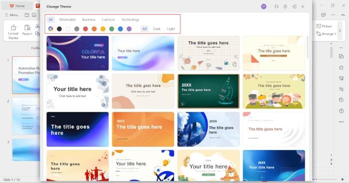 Bước 2: Trong cửa sổ này, bạn sẽ có nhiều lựa chọn. Bạn có thể lọc theo các chủ đề khác nhau như Minimalist, Business, Cartoon, Technology hoặc lọc theo bảng màu. Chọn mẫu ưng ý, và theme sẽ được cập nhật ngay lập tức.