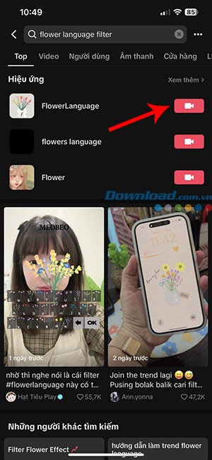 Bước 2: Khi kết quả tìm kiếm hiển thị, bạn sẽ thấy tên bộ lọc FlowerLanguage. Hãy nhấn vào biểu tượng quay video nằm ngay cạnh tên bộ lọc này để bắt đầu.