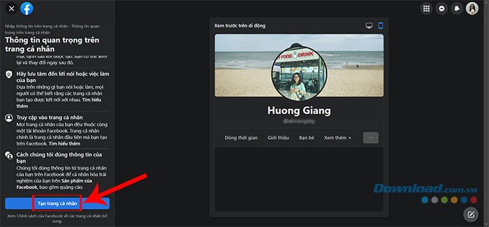Bước 2: Nhấn chọn vào tùy chọn Tạo trang cá nhân mới xuất hiện trong cửa sổ pop-up.