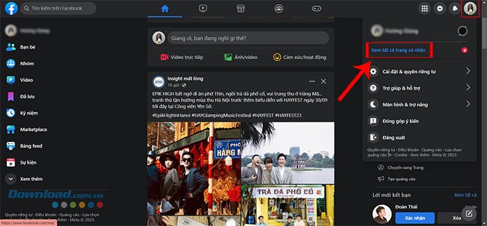Bước 1: Truy cập Facebook thông qua trình duyệt web và đăng nhập vào tài khoản của bạn. Sau đó, nhấp vào biểu tượng avatar nằm ở góc trên cùng bên phải màn hình. Trong cửa sổ pop-up hiện ra, hãy chọn Xem tất cả trang cá nhân.