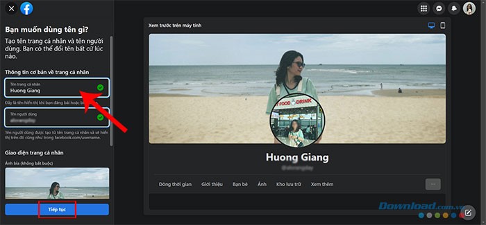 Bước 4: Điền thông tin Tên trang cá nhân mới, Tên người dùng mong muốn và sau đó nhấn nút Tiếp tục.