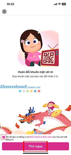 Bước 1: Trước khi sử dụng, hãy tích vào ô vuông để đồng ý với các điều khoản và điều kiện sử dụng. Tiếp theo, nhấn vào nút Thử ngay để tiếp tục.