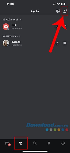 Bước 2: Sau khi ứng dụng Discord được mở, hãy chọn tab Bạn bè. Tiếp theo, chạm vào biểu tượng thêm bạn bè, thường nằm ở góc trên cùng bên phải của màn hình.
