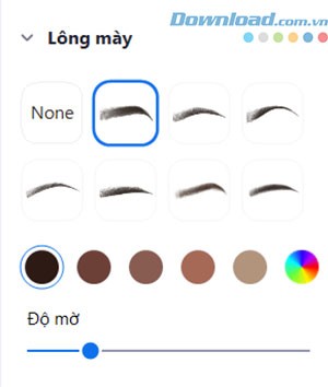 Tiếp theo, chọn màu sắc cho hiệu ứng lông mày từ các tùy chọn màu có sẵn hoặc tạo một màu sắc tùy chỉnh theo ý muốn. Cuối cùng, điều chỉnh độ mờ của bộ lọc bằng thanh trượt để tăng hoặc giảm mức độ hiển thị.