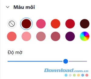 Đối với màu môi, chỉ có hai tùy chọn điều chỉnh là màu sắc và độ mờ. Người dùng có thể chọn màu môi yêu thích từ bảng màu được cung cấp, sau đó điều chỉnh độ đậm nhạt bằng thanh trượt để có được sắc thái phù hợp.