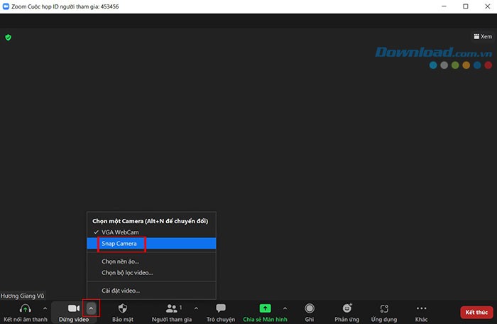Bước 4: Khi đã tham gia cuộc họp trên Zoom, hãy tìm và nhấn vào biểu tượng mũi tên nằm cạnh nút Bắt đầu video. Tiếp theo, chọn Snap Camera từ danh sách các tùy chọn, và filter bạn đã chọn trên Snap Camera sẽ ngay lập tức được áp dụng trong cuộc họp Zoom.