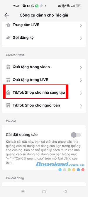 Bước 3: Trong danh sách các tùy chọn, chọn TikTok Shop cho nhà sáng tạo, mục này nằm trong phần Creator Next.
