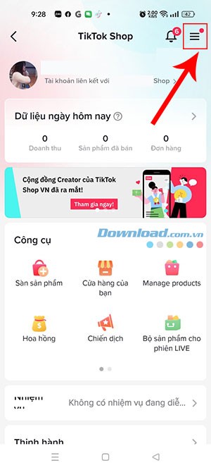 Bước 4: Khi giao diện TikTok Shop hiển thị, nhấn vào biểu tượng ba gạch ngang, vị trí tương tự như bước trước – góc trên cùng, phía bên phải.