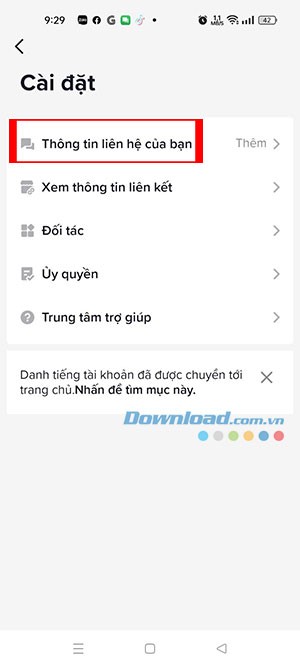 Bước 5: Trong trang Cài đặt, bạn sẽ thấy mục Thông tin liên hệ của bạn, hãy chọn vào đó.