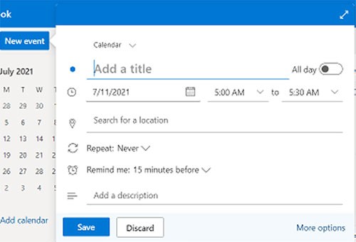 Bước 1: Trong Outlook, hãy chuyển đến mục Lịch và chọn New Event để tạo sự kiện mới.