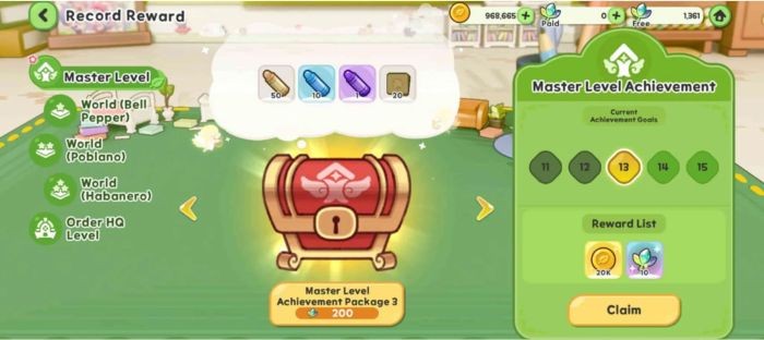 Hệ thống Record Reward trong Trickcal: Chibi Go tương tự như một bảng xếp hạng thành tích. Khi hoàn thành các mốc nhất định, ví dụ như nâng cấp Master Level, người chơi sẽ mở khóa được những phần thưởng chứa Crystal Leaf.
