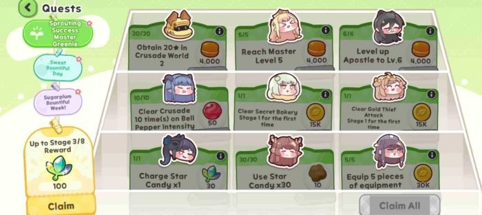 - Stage Quest: Thưởng cho người chơi khi đạt được các cột mốc quan trọng, ví dụ như hoàn thành một chương mới, nâng cấp Apostle lên bậc cao hơn hoặc mở khóa một tính năng hệ thống mới.