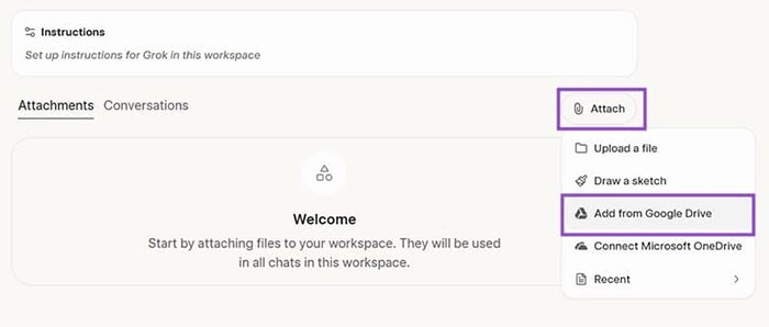Để đưa các tệp, hình ảnh hoặc tài liệu từ Google Drive vào Grok Studio, hãy thực hiện theo các bước sau: