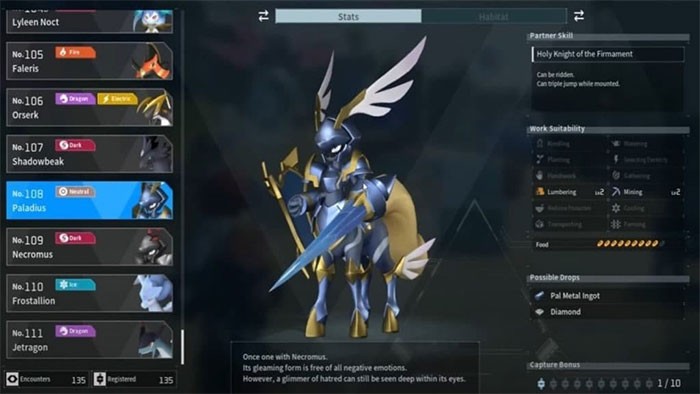 Paladius, với mã số Paldeck là 108, là một Pal sở hữu khả năng hỗ trợ đắc lực trong nhiều công việc.