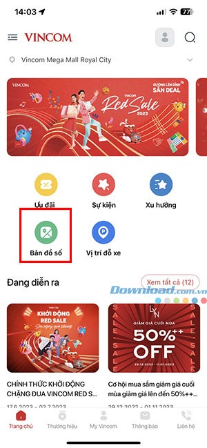 Hướng dẫn chi tiết (Bước 1): Khởi động ứng dụng MyVincom, sau đó lựa chọn trung tâm thương mại bạn muốn đến và truy cập vào mục Bản đồ số.