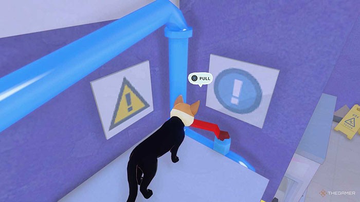 Leo lên các máy chơi game ở phía bên trái và tiếp tục di chuyển sang trái cho đến khi tìm thấy công tắc điều khiển các đường ống ở phía bên kia bức tường. Việc di chuyển vòng quanh bức tường có thể hơi khó khăn, nhưng chỉ cần đi chậm rãi và thực hiện một vài cú nhảy nhỏ, bạn sẽ vượt qua được. Sau đó, kéo cần gạt và nước sẽ tràn ra từ chỗ rò rỉ phía trên dây điện, máy sẽ tắt và vịt con sẽ đi theo chú mèo.