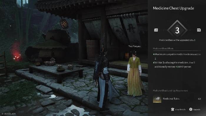 Để tiến hành nâng cấp, hãy đến Evercare Clinic ở phía Tây Qinghe, gặp gỡ Yao Yaoyao và chọn tùy chọn nâng cấp Medicine Chest. Sau đó, nộp tất cả các Medicinal Tales mà bạn đang sở hữu để tăng dung lượng thuốc có thể mang theo và nâng cao hiệu quả hồi máu.