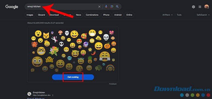 Bước 2: Tìm kiếm Emoji Kitchen và chọn nút Nấu ăn để bắt đầu.
