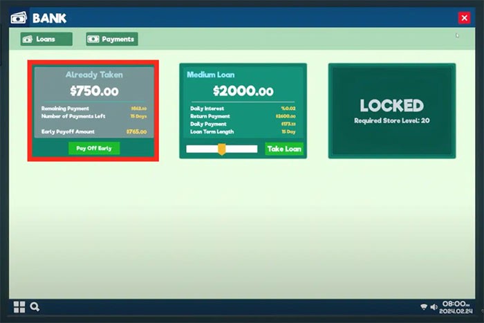 Supermarket Simulator cung cấp một hệ thống cho vay, cho phép người chơi vay tiền và trả lại sau. Đây có thể là một nguồn vốn quan trọng để thúc đẩy sự phát triển của doanh nghiệp.