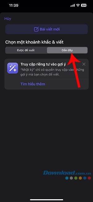 Bước 1: Khởi động ứng dụng Journal và chạm vào nút +. Sau đó, chuyển sang tab Gần đây trên trang gợi ý.