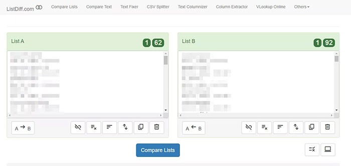 Bước 4: Sao chép toàn bộ nội dung trong danh sách following và dán vào hộp List A trên ListDiff. Tiếp theo, lặp lại quy trình này bằng cách sao chép danh sách followers_1 và dán vào hộp List B của trang web ListDiff. Cuối cùng, nhấn vào nút Compare Lists.