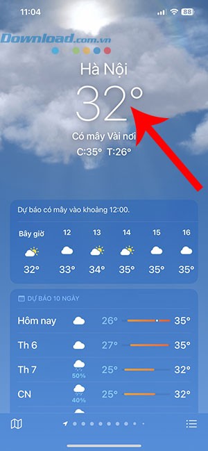 Khi mở ứng dụng Apple Weather trên iPhone, người dùng sẽ ngay lập tức quan sát được nhiệt độ hiện tại được hiển thị nổi bật. Bên cạnh đó, thông tin về nhiệt độ cao nhất và thấp nhất dự kiến trong ngày cũng được cung cấp.