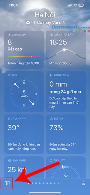 Bước 1: Để bắt đầu, hãy chạm vào biểu tượng bản đồ, được đặt ở góc dưới cùng bên trái của giao diện ứng dụng Thời tiết.