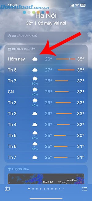 Bước 1: Từ giao diện chính của ứng dụng Thời tiết, hãy chạm vào ngày bạn muốn xem dự báo chi tiết trong phần Dự báo 10 ngày. Một màn hình mới sẽ mở ra, hiển thị đầy đủ các thông tin liên quan, bao gồm cả chỉ số UV và tình hình gió.