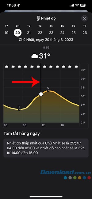 Bước 2: Để xem nhiệt độ dự kiến trong suốt 24 giờ của ngày đã chọn, bạn chỉ cần giữ ngón tay trên biểu đồ và trượt sang trái hoặc phải.