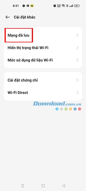 Bước 3: Trong phần các cài đặt khác, hãy tìm và chọn mục Mạng đã lưu. Đây là nơi lưu trữ thông tin về tất cả các mạng WiFi mà thiết bị của bạn đã từng kết nối.