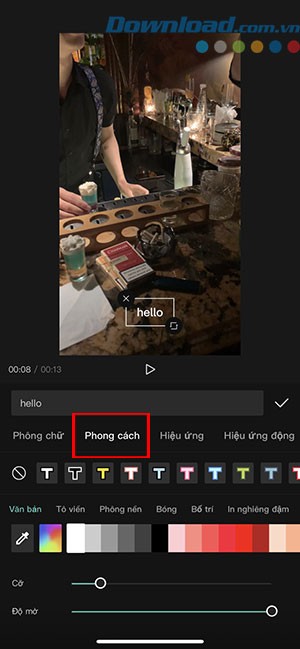 Bước 5: Để tăng tính thẩm mỹ cho văn bản, phù hợp với nội dung video, bạn có thể tùy chỉnh bằng cách chọn Phông chữ và Phong cách để thay đổi kích thước, màu sắc, hiệu ứng bóng, viền chữ,...