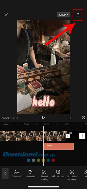 Bước 6: Sau khi đã hài lòng với văn bản được thêm vào video, hãy nhấn nút mũi tên ở góc trên bên phải màn hình để xuất video vào thư viện ảnh của thiết bị.