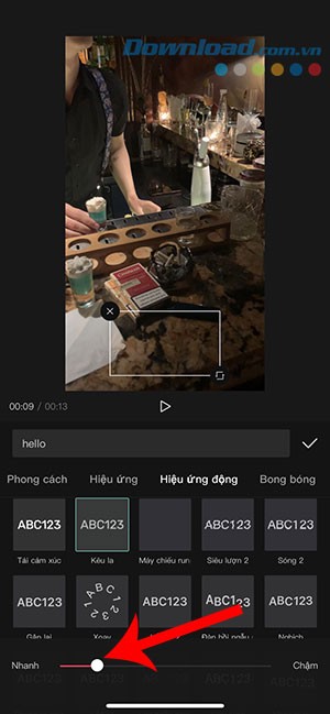 Bước 3: Khi đã chọn được hiệu ứng mong muốn, một thanh điều khiển thời gian sẽ xuất hiện. Người dùng có thể điều chỉnh tốc độ hiệu ứng bằng cách kéo thanh trượt về phía trái để tăng tốc (Nhanh) hoặc kéo về phía phải để làm chậm hiệu ứng (Chậm).