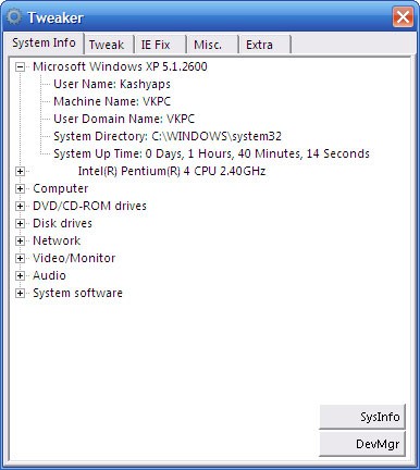 Tweaker cho phép bạn thực hiện các điều chỉnh registry cơ bản của hệ thống. Bạn có thể tìm kiếm thông tin hệ thống, quản lý thiết bị, sao lưu và khôi phục cài đặt của Internet Explorer trong trường hợp bị tấn công.