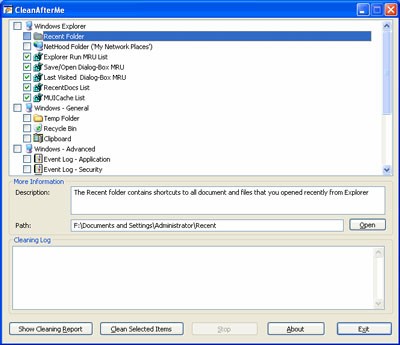 Ngoài ra, CleanAfterMe còn hỗ trợ dọn dẹp danh sách các tập tin được mở gần đây, các khóa Registry liên quan đến lịch sử mở tập tin, thư mục tạm, nhật ký sự kiện (event log) và thùng rác.