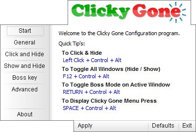 Clicky Gone là một phần mềm miễn phí, nhỏ gọn và dễ sử dụng, được thiết kế để đáp ứng nhu cầu này. Chương trình cung cấp khả năng ẩn các cửa sổ một cách triệt để, loại bỏ chúng khỏi mọi hiển thị, bao gồm cả thanh Taskbar và trình quản lý tác vụ (khi sử dụng tổ hợp phím Ctrl + Alt + Delete).