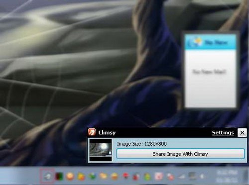 Sau khi cài đặt, Climsy sẽ xuất hiện một biểu tượng nhỏ trên khay hệ thống. Mỗi khi bạn nhấn phím Print Screen (Prt Sc), một thông báo sẽ hiển thị ở góc dưới bên phải màn hình, cung cấp thông tin về kích thước ảnh, bản xem trước và tùy chọn tải ảnh lên mạng.