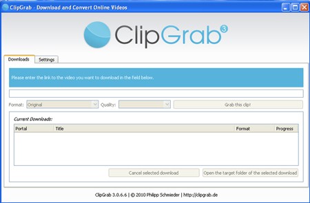 Giao diện chính của ClipGrab được chia thành hai tab chính: Download để tải video và Settings để cấu hình chương trình.