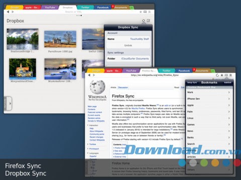Khác với các trình duyệt khác chỉ hỗ trợ tải lên dữ liệu một chiều lên Dropbox, CloudSurfer Free cung cấp tính năng đồng bộ hóa Dropbox thực sự. Mọi tệp tin được tải xuống đều sẽ được tự động đồng bộ với tài khoản Dropbox của bạn. Trình quản lý tệp tích hợp sẵn cho phép bạn xem tài liệu, hình ảnh và phát các tệp đa phương tiện trực tiếp từ Dropbox.