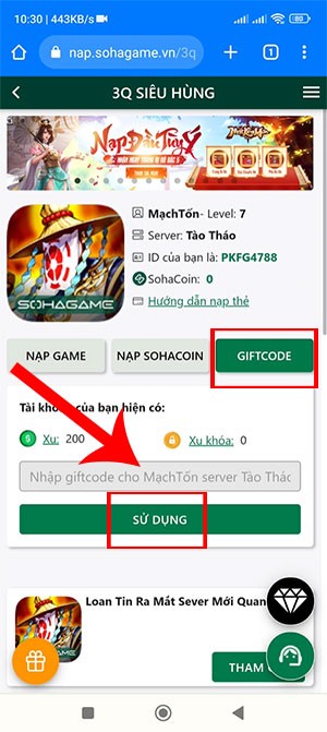 Bước 3: Chọn tab Giftcode, sau đó nhập chính xác mã code đã được cung cấp hoặc sao chép mã code vào ô dành riêng. Cuối cùng, nhấn nút Sử dụng để xác nhận.