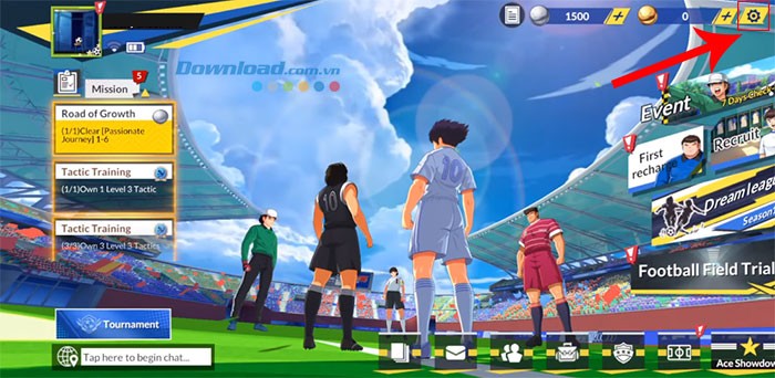 Bước 1: Tiến hành khởi động ứng dụng Captain Tsubasa: Ace trên thiết bị của bạn. Sau đó, hãy chọn biểu tượng bánh răng, đại diện cho phần cài đặt, nằm ở góc phía trên, bên phải màn hình.
