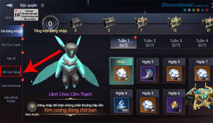 Bước 2: Trong giao diện Đặc quyền vừa mở, bạn sẽ thấy các tab chức năng khác nhau. Hãy chọn tab có tên Mã quà tặng để tiếp tục.