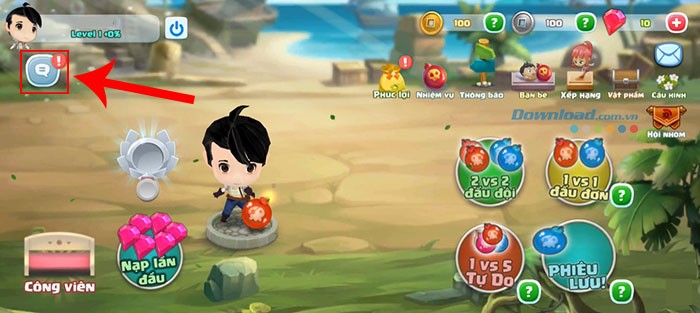 Bước 1: Khởi động ứng dụng Crazy Boom trên thiết bị của bạn. Tiếp theo, hãy nhấn vào biểu tượng chat, được đặt ở góc trên cùng bên trái màn hình, ngay phía dưới khu vực hiển thị thông tin tài khoản người chơi.
