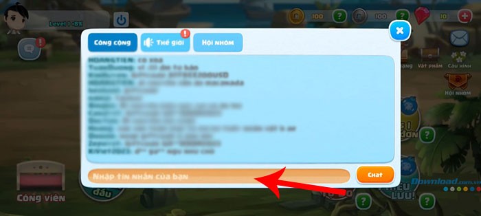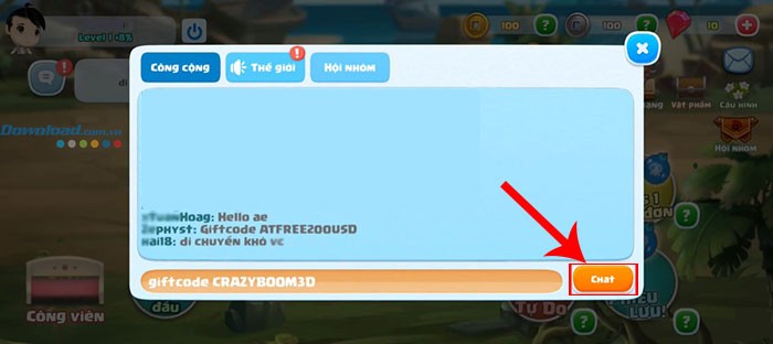 Bước 3: Tiến hành nhập code theo đúng cú pháp: giftcode, sau đó thêm mã code mà bạn đã nhận được. Cuối cùng, nhấn nút Chat để gửi tin nhắn và hoàn tất việc nhập code.