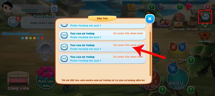 Bước 4: Quay về giao diện chính của trò chơi. Nhấn vào biểu tượng thư nằm ở góc trên cùng bên phải màn hình. Sau đó, chọn Thư của hệ thống và nhấn Nhận để nhận thưởng.